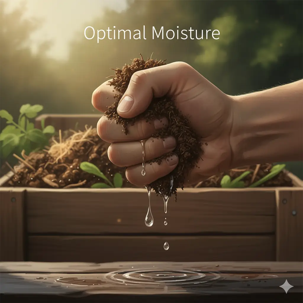 The microbes in your pile require a thin film of water around their bodies to absorb food and move. If the film is too thick (too much water), oxygen can’t pass through; if the film is gone (too dry), they can’t eat. Optimal moisture ensures perfect gas exchange.